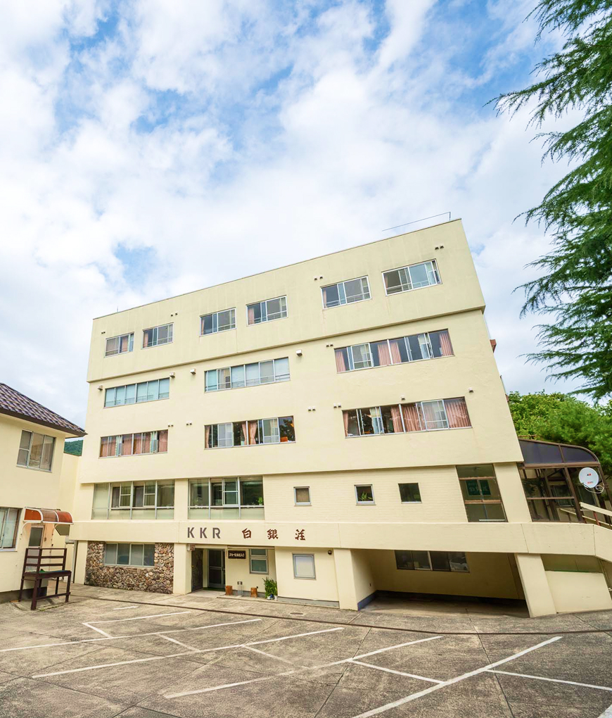 湯けむり漂う蔵王温泉のほぼ中央に佇む白い瀟洒な五階建てのKKR蔵王白銀荘。眼前には中央ロープウェイ、蔵王ロープウェイの乗り場が隣接し、スキー、温泉、そして蔵王の四季折々の美しさをとらえるに絶好の基地といえます。